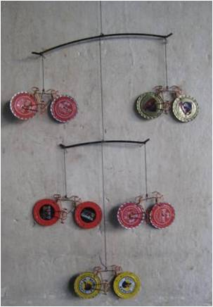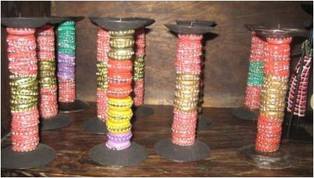 Bottle tops have also been used for many crafts such as these decorative candle sticks on sale in a craft shop.