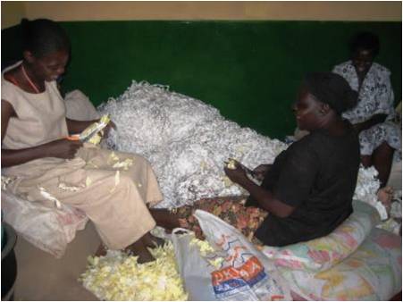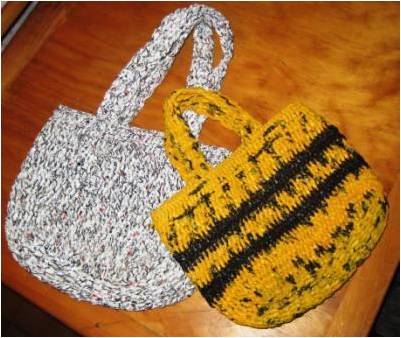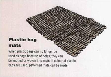 Weaving techniques are used to make hats or floor mats from supermarket bags as with this idea from Footsteps.