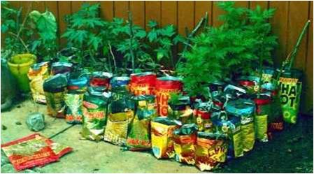 Plastic bags of many types can be used in tree and plant nurseries, not just the commercial black plastic ones. These crisp packets make a very appropriate nursery: