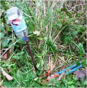 The bottle on the left has been used as a safety measure to stop people hurting themselves on a stake.