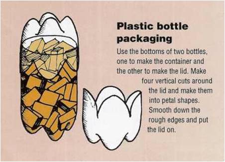Bottles can be cut in many ways for toys, teaching aids and other useful containers at home and in schools, such as these ideas from Footsteps
