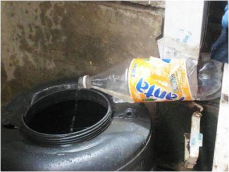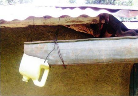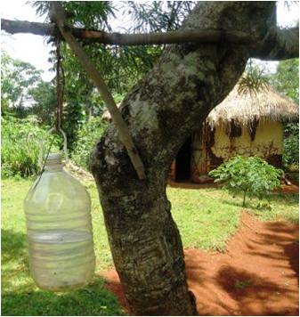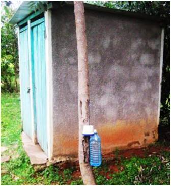 A small hole in the bottom of a bottle enables the bottle to hold water for washing at home and outside the latrine